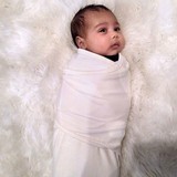North appeared to be wearing a black onesie underneath a white blanket and was lying across a fur rug in the photo.